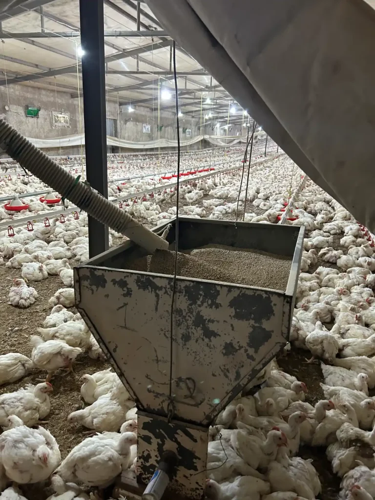 Bahsettiğimiz üzere civcivler çiftlikte geçirdikleri süreyi yem yiyerek, su içerek ve olduğu yerde yatarak geçirir. Hareket etmeleri istenmez, yedikleri yemin en kârlı oranda canlı ağırlığa dönmesi istenir. Yemi hayvanlara dağıtma hatları ile otomatik veren çiftlik yemin içeriğini bilmez, sözleşmede olduğu gibi tüm beslemeyi alıcı şirketin temin ettiği yemler ile yapar ve dışına çıkarsa ceza öder. Yani o piliçlerin kesim sonrasında marketteki paketinin üzerinde isminin görüleceği şirket yemleri yetiştiriciye yollar ve her şirket yemin içeriğine kendi karar verir. Yemin yüksek proteini içeriğindeki soyadan gelir, karbonhidratı ise ağırlıkla mısırdan gelir. Minerali ve vitamini hassasiyetle ayarlanan bu yemlerin içindeki geri kalan maddeler ise gizli tutuluyor. Yemler homojen yapıda tek tip pelet şeklinde hazırlanır. Civcivlerin günde ortalama yediği yem, kuru besin üzerinden kıyaslanınca yetişkin bir insanın yediğinin aşağı yukarı yarısı kadar. Yani çok hızlı bir büyüme ve şişme söz konusu. Çiftlikteki civciv başta 40 gramken 6 haftanın sonuna geldiğinde 2.5-3 kg gibi bir ağırlığa ulaşır; bu, yetişkin bir tavuk büyüklüğüdür. Halbuki bu civcivlerden birini bahçede tahıl ile serbest gezer halde beslesek büyüme hızı bu çiftlik civcivlerinin çok çok altında olur, yani o 6 haftalık hayvan hala bir elinizin içine oturabilen büyükçe bir civciv olurdu.